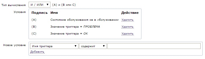 И, как Вы угадали, создаем действие, которое будет выполнено если узел не обслуживается и состояние триггера равно TRUE или FALSE