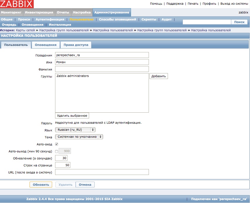 Теперь перейдем в сам заббикс - нам надо создать пользователя, такого же как в домене (наш пользователь из пункта 1) и дать ему такой же пароль как в домене у него, после чего войти под этим пользователем в веб-интерфейс zabbix.