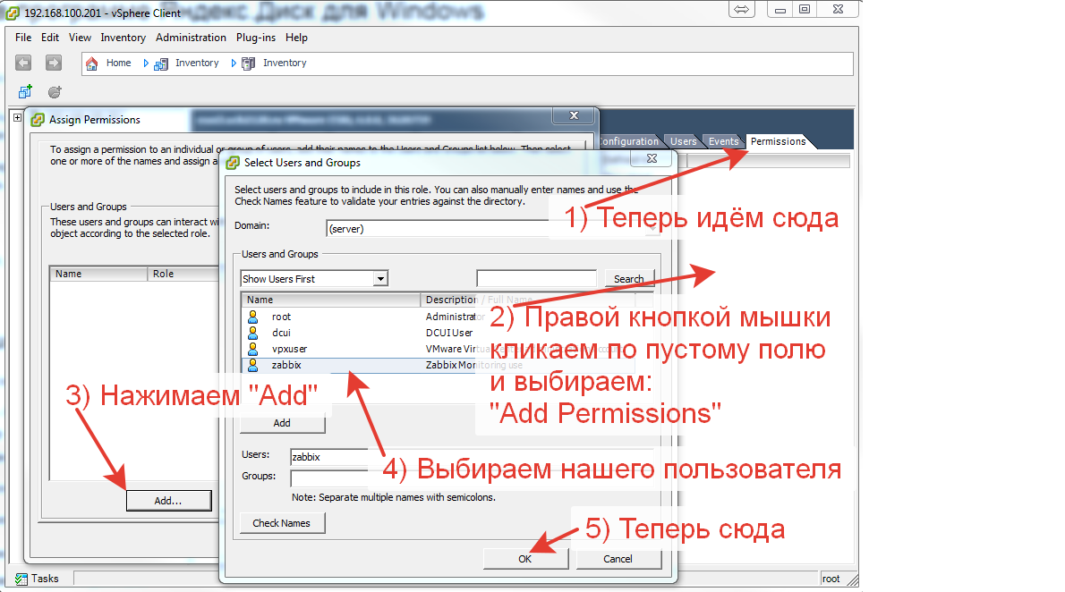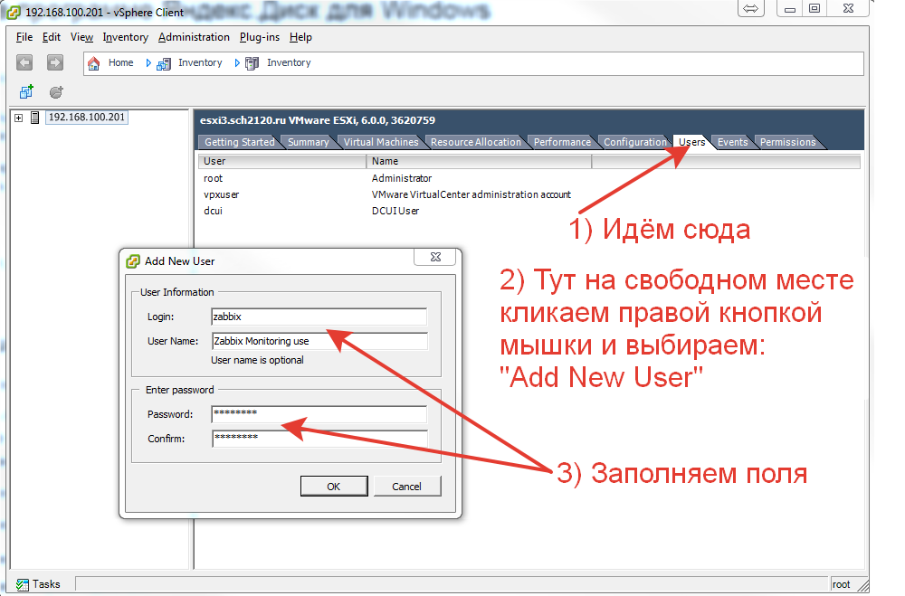 Для начала создадим пользователя с правами "только чтение" который будет ходить за данными к esxi гипервизору - для этого заходим под рутом в сферу и создаём пользователя: