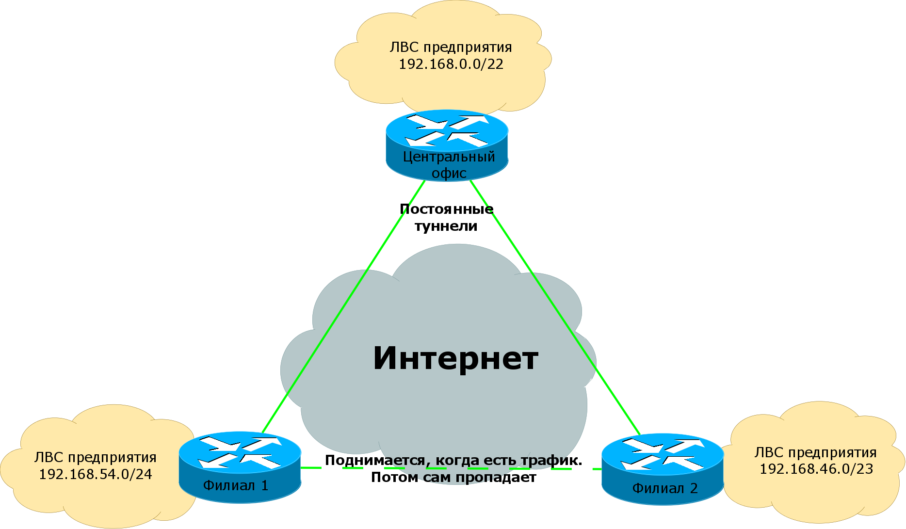 2) Офисы примерно равнозначны, потому трафик будет ходить не из центра в филиал, а между филиалами тоже